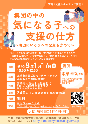 子育て支援者向けスキルアップ講座2「集団の中の気になる子への支援の仕方~周辺にいる子への配慮も含めて~」を開催します。