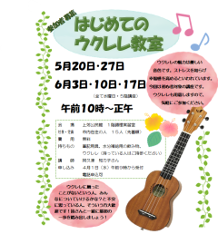 公開日:2026年04月01日芸術・文化・芸能上郊公民館はじめてのウクレレ教室(上郊公民館)開催日:2026年05月20日(水)、27日(水)、06月03日(水)、06月10日(水)、06月17日(水)