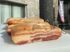 塩漬けした肉を燻製にしてベーコンをつくります。... -