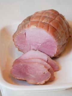 豚肉を丸めて紐で形を整えたり燻製にしたりとボンレスハムを作る工程と
